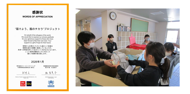 この度、JRC委員会を中心に行った「服の回収プロジェクト」の取り組みに対し、受け入れ先の団体より「感謝状」 をいただきました。本プロジェクトの実施にあたり、保護者の皆さまには多くのご協力をいただきました。心より感謝申し上げます。