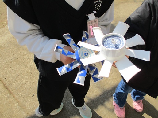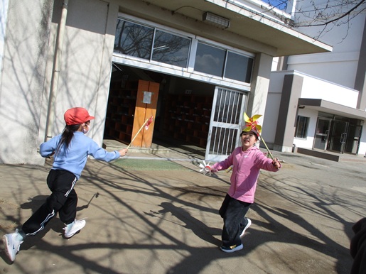 冬の遊びでは、「かざわ」や「かざぐるま」を作り、外で遊びました。