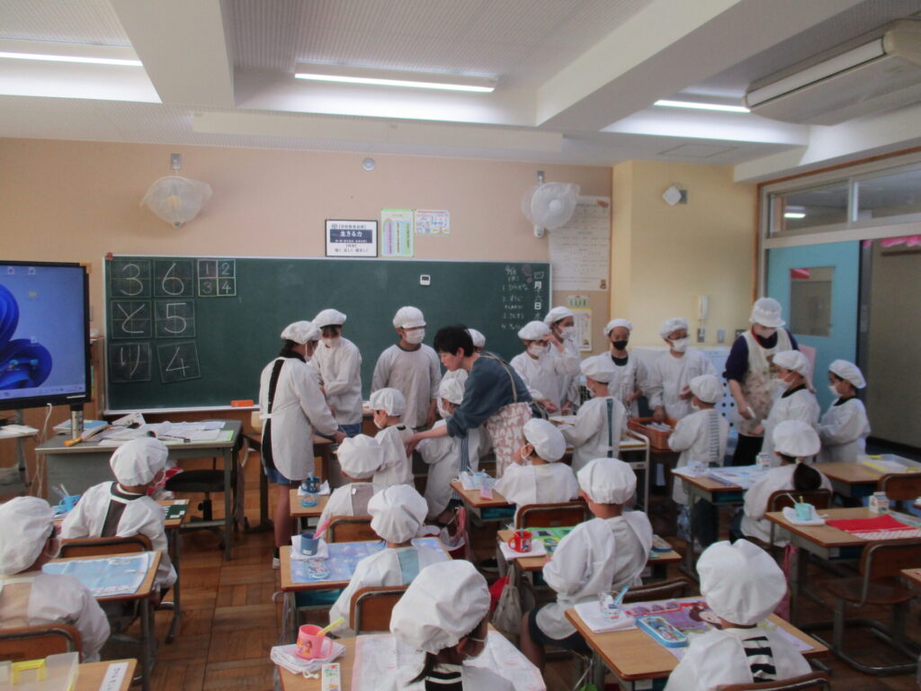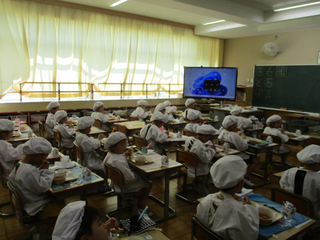 本日から1年生の給食が始まりました。6年生が給食室からの運搬や教室での配膳を丁寧にサポートしてくれました。また、パンの袋の開け方や牛乳のストローの付け方など、初めてで分からないことを一つ一つ確かめました。1年生は、初めての給食に「これ好き!」という声や「おいしい!」という声が聞こえ、教室には笑顔が溢れていました。