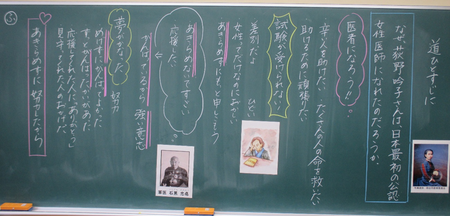 あらすじ:江戸時代末期の嘉永4年(1851年)、現熊谷市俵瀬に生まれた荻野吟子は、苦難を乗り越え日本初の公認女性医師となりました。なぜ、日本初の公認女性医師となれたのかを考え、「努力と強い意志」について話し合いました。