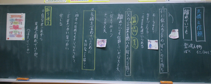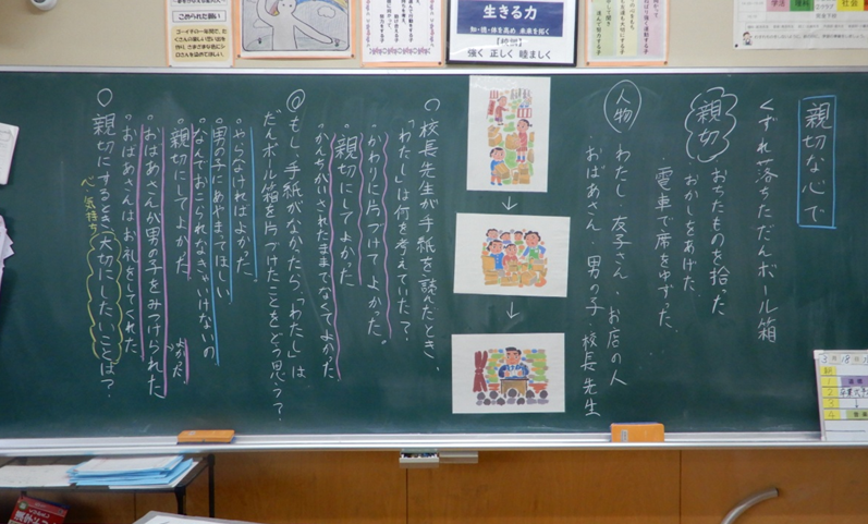 あらすじ:「私」と友子さんが買い物に行くと、小さな男の子が積んであった段ボール箱を崩してしまう場面に遭遇しました。男の子のおばあちゃんが困っていたので、代わりに段ボール箱を片づけたところ、お店の人に散らかしたと勘違いされてしまいます。誤解されたまま、嫌な気持だった「私」たちでしたが、後日、学校に謝罪と感謝の手紙が届きます。登場人物の気持ちを考えて、「親切」にすることの意義や、どんな気持ちで人に親切をするのかを考えました。