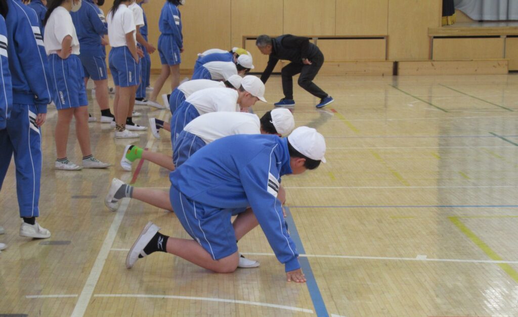 本日、熊谷市教育委員会より体育指導専門員の外村先生をお招きし、中学校進学をひかえた6年生に、中学校での体育授業につながる「集団行動」や「基礎体力づくり」「中学校入学後、苦手とする子どもが多いクラウチングスタート」について指導していただきました。児童たちは、正しいフォームや体の動かし方を学びながら、生き生きと練習に取り組んでいました。外村先生からは、「今日のように取り組むことができれば、中学校でもきっと活躍できるでしょう。」とお褒めの言葉をいただきました。