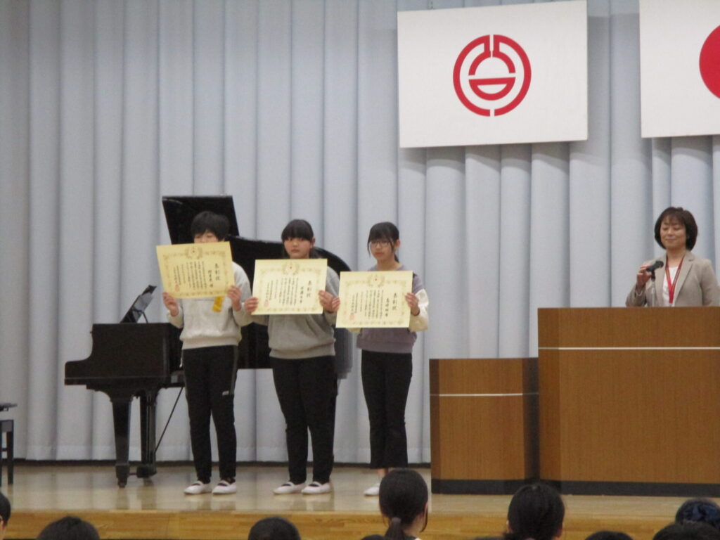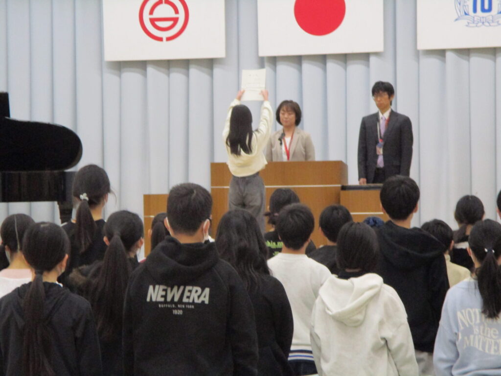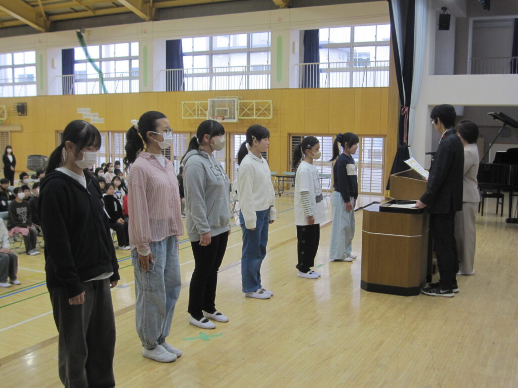 本日、6年生の修了式を行いました。修了式に先立ち、「6年間の皆勤賞」、「青少年赤十字優良児童の表彰」、「体育優良賞」、「産業教育振興会小中学校優良卒業生の表彰」を行いました。6年間の頑張りを皆で称え合いました。明日は卒業式です。教職員・在校生一同、卒業生の門出を祝うために心を込めて準備をします。